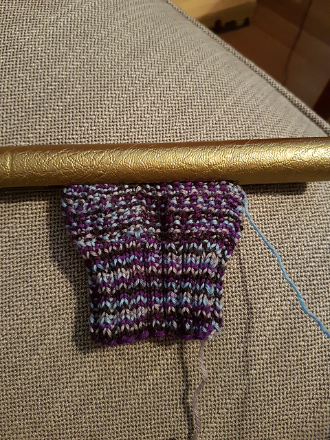 I like them, even though you really can't see the pattern on this coloured yarn. The yarn is Sheepy Time Knits Sheepy Feet yarn, and the colourway is called Soufflé Girl, which is another Doctor Who yarn club colourway. I'm not in love with the colours, but the yarn is fine. The pattern is a zig zag of knits and purls that would probably look better on a solid or semisolid yarn.