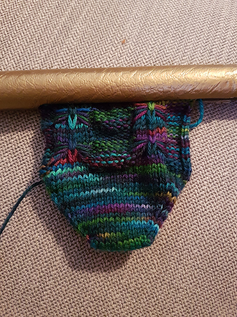 As I had finished all of my socks, I also cast on for another pair for me. I'm making Cookie A's Ellington socks, and I'm using KnitPicks Stroll sock yarn in the Firecracker Heather colourway.
