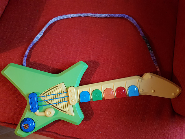An I-cord neck band for Ella's toy guitar
