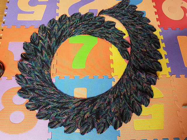 I really like this one! It's more a scarf than a shawl, and I've used it a lot during our long, cold winter this year, just wrapping it several times around my neck. I ended up with 38 leaves on mine, so it's quite long. It's made with Lana Grossa Mielenweit Freestyle yarn, in the colourway 7702. I think I bought this via Amazon, if I remember correctly, and it's a very nice, regular sock yarn.