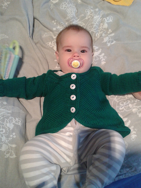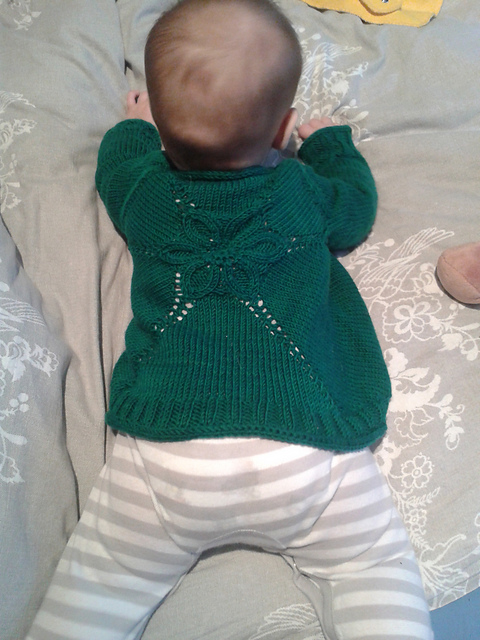 Once that was finished I started the Flower cardigan for Ella, and finished it about two weeks ago I think. I made the one year size, so it's a little big on her still, but she can wear it this fall anyway: