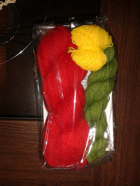 I also bought a kit for a Strawberry hat from Tant Kofta, which contained a lace weight merino/angora yarn dyed in three different colours, to make a hat from: