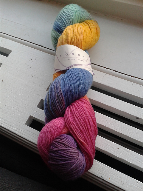 Lorna's Laces Shepherd sock yarn (80 % wool/20 % nylon, 398 m/100g), in the colourways Childsplay (the multi-coloured one) and Envy (the green one). Both of these are destined to become socks for my mother.