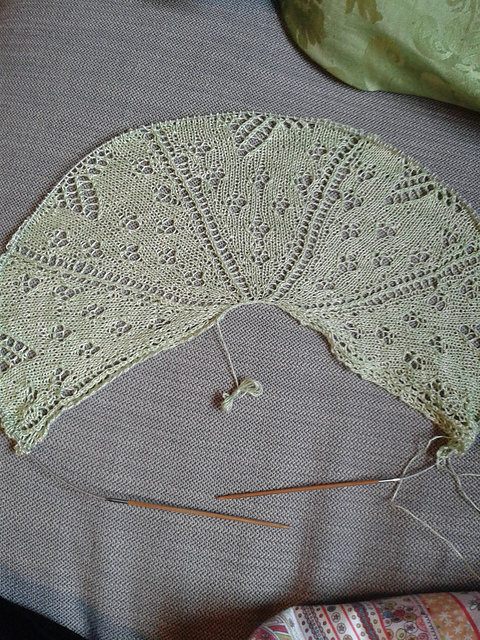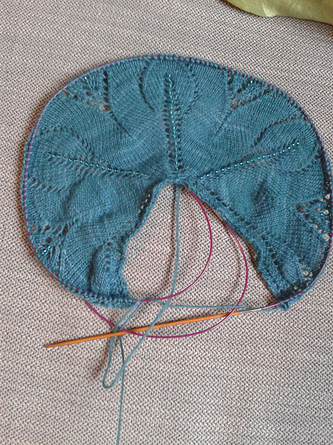 Next up is another lace shawl, and this one I'm making with beads! It's the Fiori de Sole shawl, and I'm using some old stash Malabrigo Lace yarn, in the colurway Emerald. It's so much fun, but I'm not working much on this one either right now. It will get done eventually though.