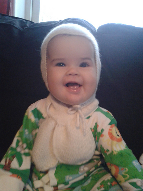 Then I started a winter set for Ella, a hat, a scarf, a pair of mittens, and I had yarn left over to make a pair of matching socks as well. I bought two skeins of Drops Baby Alpaca Silk yarn in an off-white colour, and made a set from a Drops pattern. I finished the set on October 18th.