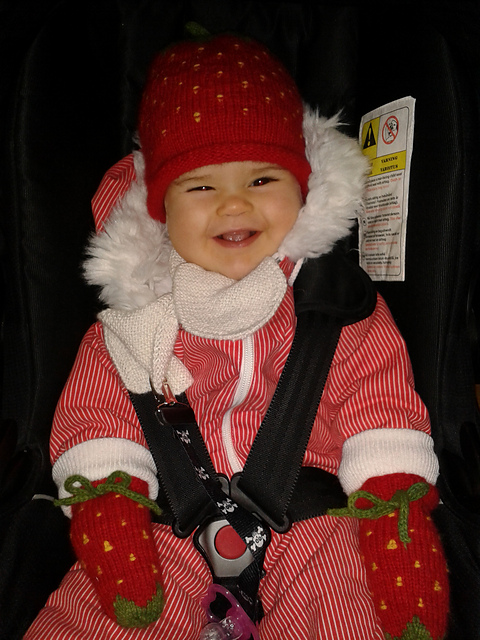 I chose not to use the pattern that came with the hat, where the green leafy edge was at the bottom of the hat, but used this Drops pattern instead. I made the mittens as simple tubes, and to protect the small fingers from the colourwork strands I also made an inside lining with the red yarn, so they're double layered and very warm. Ella has used this set all winter, and gotten lots of compliments on them as well.