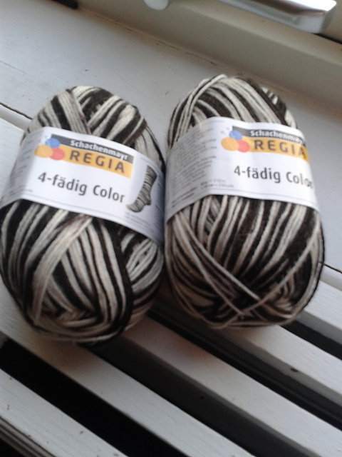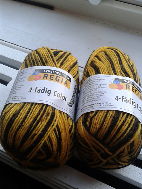 Regia Color 4-ply in the colourways Zebra and Tiger (I think you can guess which is which). My mother claimed the white ones, and the orange ones will be socks for me.