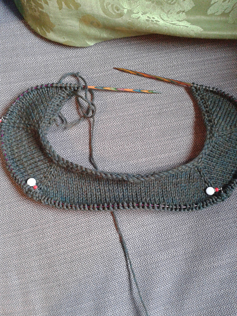 Finally, I also cast on for a new cardigan for me. I haven't really knitted much for myself, other than socks, for a long while, so I thought it was time. I had a couple of skeins of Cascade 220 in the Liechen colourway balled up, that I had started a Dark and Stormy cardigan with a long, long while ago. A couple of weeks ago I finally decided that I didn't want that cardigan anymore, so I frogged the five rows I had made, and now I'm using the yarn for the Krydda cardigan. So far it's going by very fast, but I haven't started the lace pattern yet. It should be fun though!