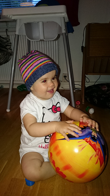 When this was done, I made a matching striped scarf (as you can see in the photo above) and a pair of mittens to match as well. The mittens are also knit with a double hem and lined to prevent the fingers from snagging in the strands, but unfortunately I ran out of yarn so the thumbs are too short! Ella did NOT enjoy wearing them, so they have mostly been languishing in the drawer. But they are cute!