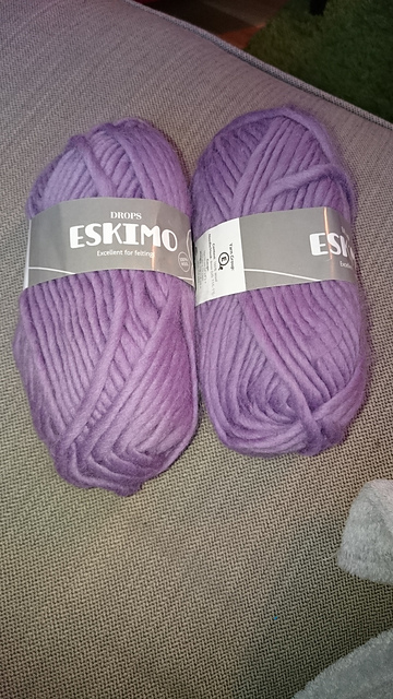 Five Skeins of Garnstudio Drops Eskimo (100 % wool), in the colourway 54 Pale Purple. These will become an Owlet sweater for Ella.
