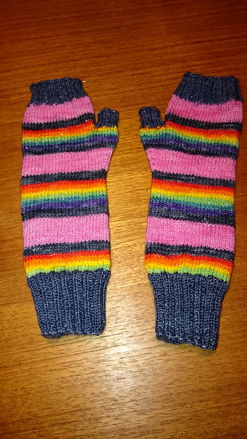 After the hat was done I still had a lot of the yarn left, so I used up everything but a very small bit of the dark blue skein for a pair of fingerless mitts for myself.