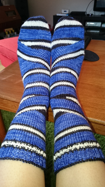 I made them in FiberNymph Dye Works Bounce yarn, in the Tardis colourway, as we're both Dr Who fans, and she loved them. Now I just need to buy an additional skein to make something for myself too...