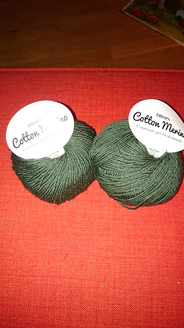 Garnstudio Drops Merino Cotton (52 % wool/48 % cotton), in the colourways Dark Green 22 and Light Green 10. I've already used up almost all of it in a hat for my friend Christine. I'll show it to you a bit further down.