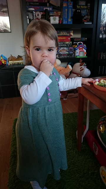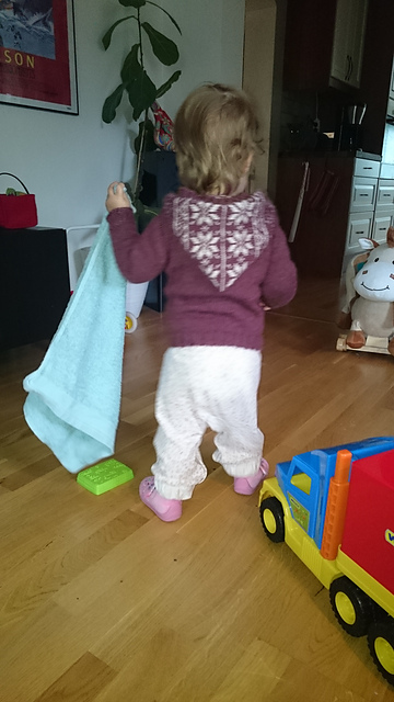 I've been wanting to make this sweater since I first saw it, but at first it wasn't available in Europe due to the VAT changes. But then all of a sudden I could get it, and Ella has worn it a lot this winter as it is so warm: However, I knit it on the small side, so I actually put it away the other day as it is too small.