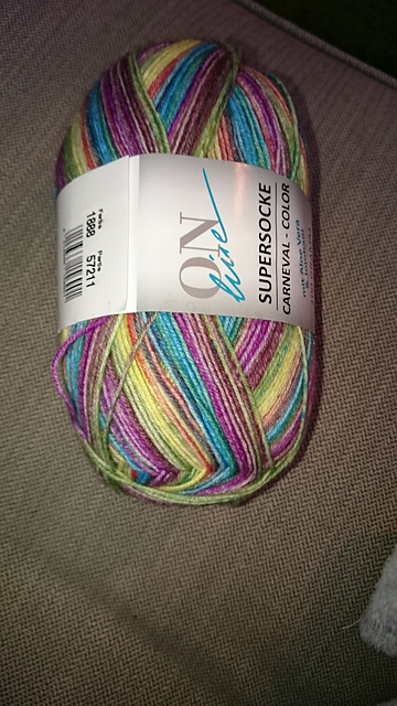 Online Supersocke Carneval colour yarn (75 % wool/25 % nylon), in the 1888 colourway. Destined to become socks, possibly for myself. We'll see.