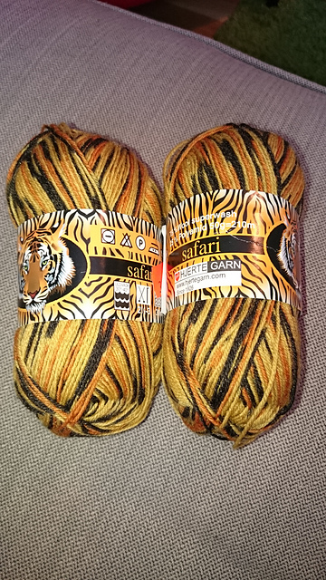 Hjertegarn Safari (75 % wool/25 % nylon), in the 7698 Tiger colourway. Mom claimed these as hers, so I'll probably make another pair of socks for her.