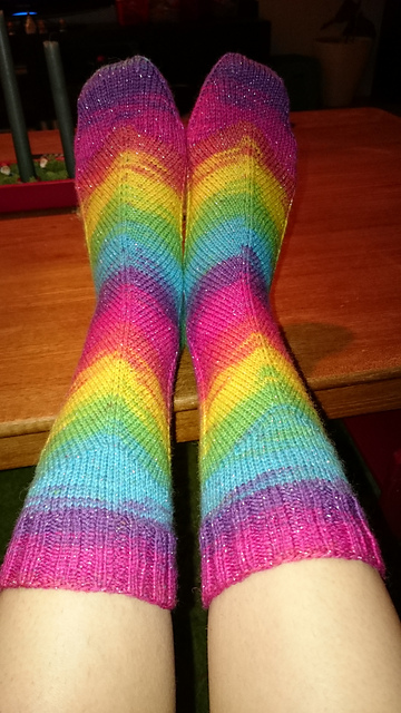 I knit the Getting Down version for both socks, from the Partying it Up and Getting Down socks, and I used a skein of Opal Happy with Silbereffekt 9090 Surprise yarn (Opal has self-striping with glitter. Just saying.) that I had to get as soon as I saw it. I also got a skein in another colourway, 9091.