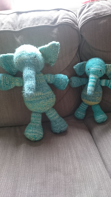 I also knit Ella and Molly matching Elijah Elephant toys, out of a very cheap acrylic yarn. Me and Ella went grocery shopping one day, and Ella went right past all the toys and stuff in the store, but once she saw this skein of yarn she just had to have it. Funny kid! And of course I had to support her yarn love, so I bought it for her and made toys from it.