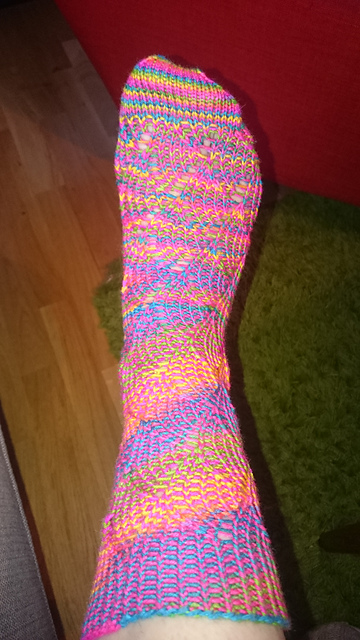 These are the Pomatomus socks, also by Cookie A, and they are made with Mad Color Fiber Arts Tasara yarn (80 % merino/20 % silk), in the Fruity Oaty Bar colourway. I have to admit that when I got this skein a couple of years ago (it was a club skein), I wasn't all that thrilled with the colours, as I thought they were a bit too bright for my taste. Now that I've knit it up I absolutely love it, I think they are the happiest socks I've knit in quite a while!