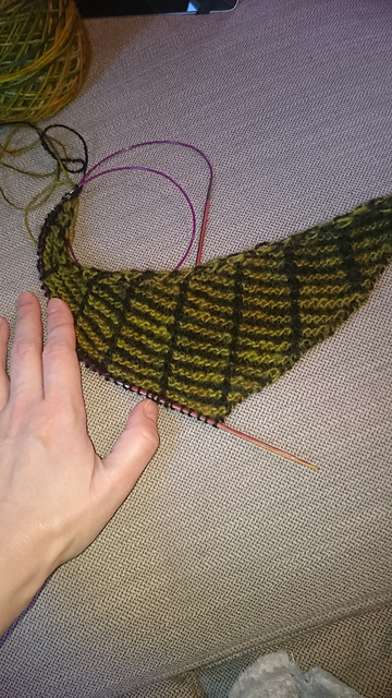 Next up I cast on with the wool birthday yarn that I got from Thomas. As I have only a very wide estimate of the meterage of the skein, I decided to stripe it with black, so I bought a skein of two-ply wool from Ullcentrum in black. I cast on for the Crossfire shawl, and it's going great! I only needed the pattern for the firstfew rows, so I think this might become my break knitting once the socks are done.