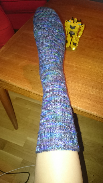 I've started four new projects since last too! I'm designing a pair of toe-up, spiralling socks that I'm making with Mad Color Fiber Arts Shiny yarn in the colourway Medusa Cascade. I've had to rip them back once all the way to the toe, and I reknit the first heel two times as it didn't fit my foot properly, but now the first sock is finished and I'm just about to start the gusset increases on the second sock. I really, really like them, and they are currently my break knitting at work.