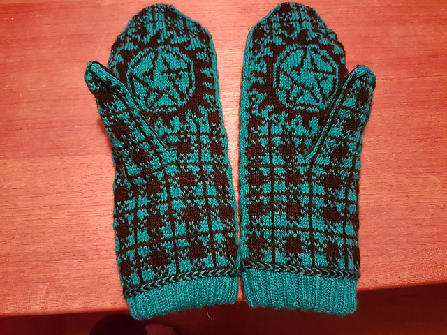 They are made with KnitPicks Palette yarn, in the colourways Marina and Black, and I lined them with some red Palette in the Serrano colourway. I really like them, even though they are a little bit big, but the lining helped a bit with that.